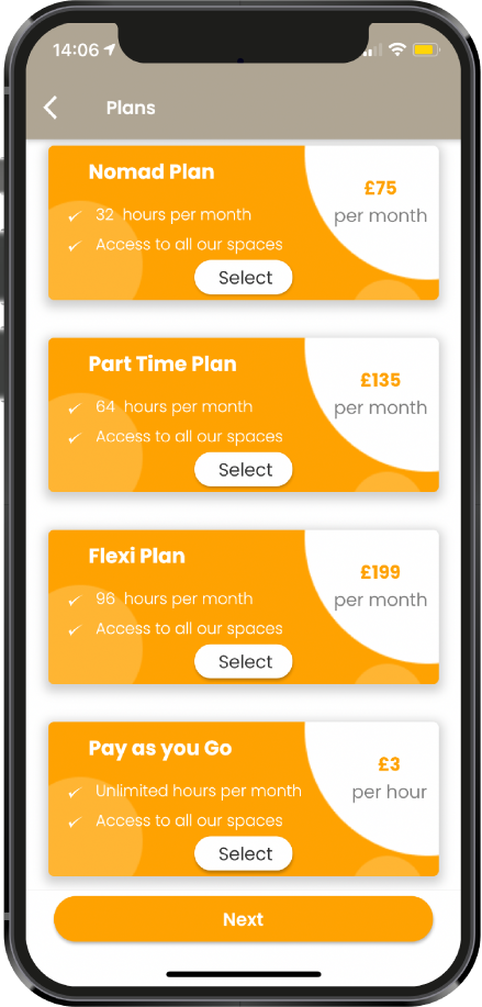 Use the Coworking Nomads App to check in and out of the space, you'll only be charged for the time you spend there.